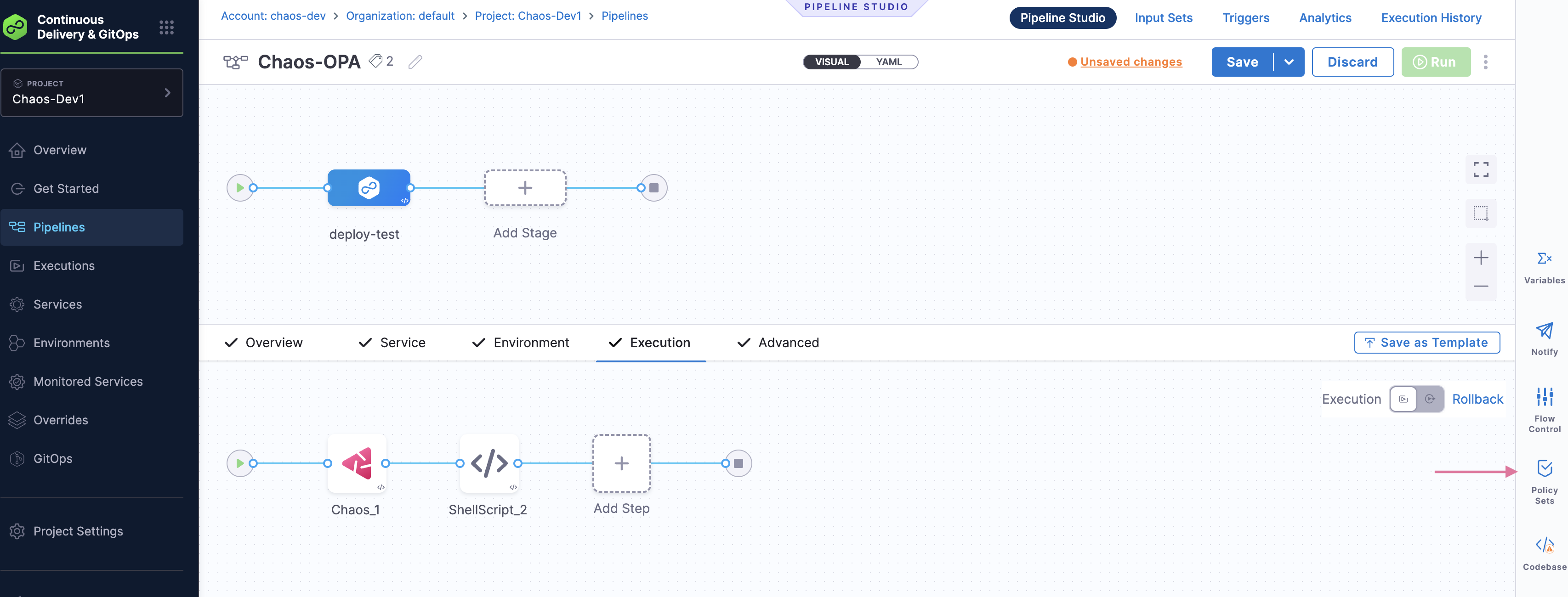 To know more about how to execute chaos experiments in a pipeline, go to Experiments in Pipeline.