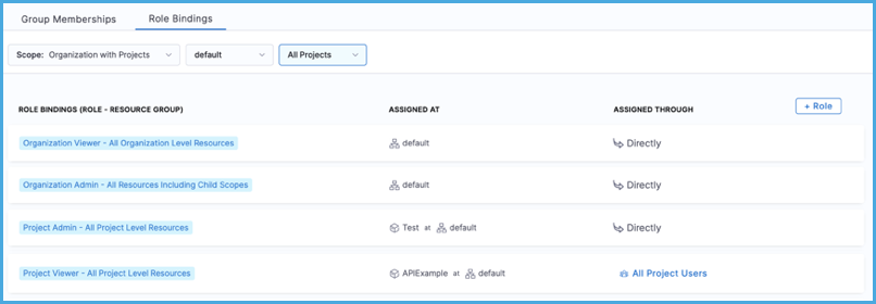 You assign roles and resource groups to users to grant them permissions and access in Harness. Users can inherit roles and resource groups from group membership, or you can assign roles and resource groups directly to individual users. For more information about assigning roles and resource groups, go to RBAC in Harness: Role binding.