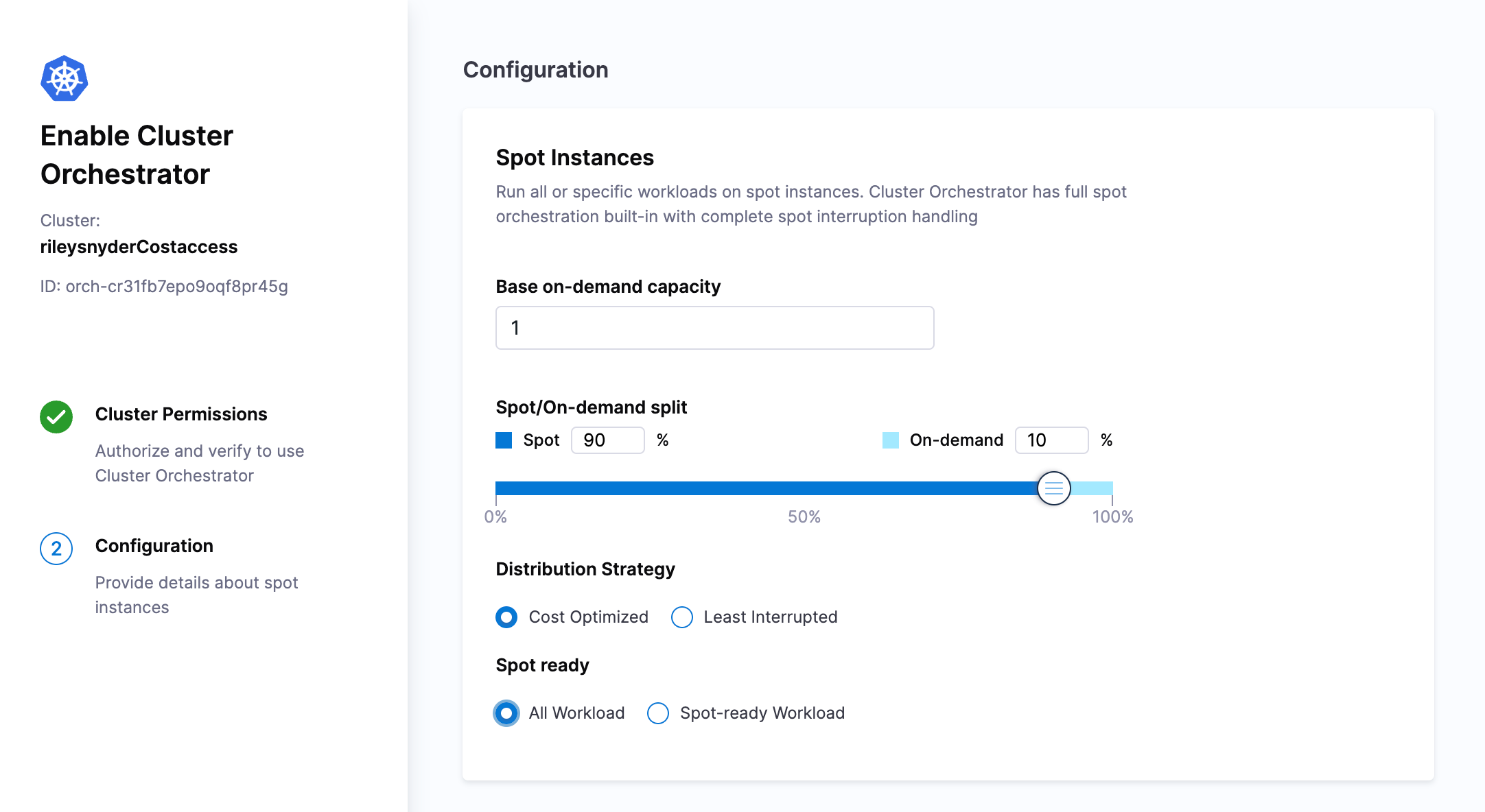 On the first page we can set a base on-demand capacity, split of spot vs on-demand compute, and the distribution strategy.